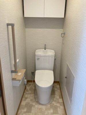上部に吊戸棚を設けた使いやすいトイレで、 手すりもあり、お母さまが住まわれる場合にも安心です。